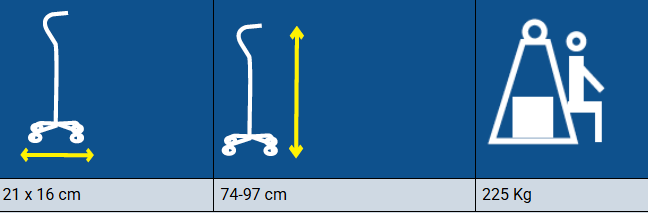 Constructed with a reinforced steel frame, this cane supports users up to 225 kg, making it ideal for bariatric patients and demanding rehabilitation environments. The small quad base design provides enhanced stability while remaining more maneuverable in tight indoor spaces.